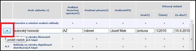 K hlavným nákladovým položkám, ktoré ste rozpočtovali v žiadosti, môžete postupne pridávať potrebný počet riadkov